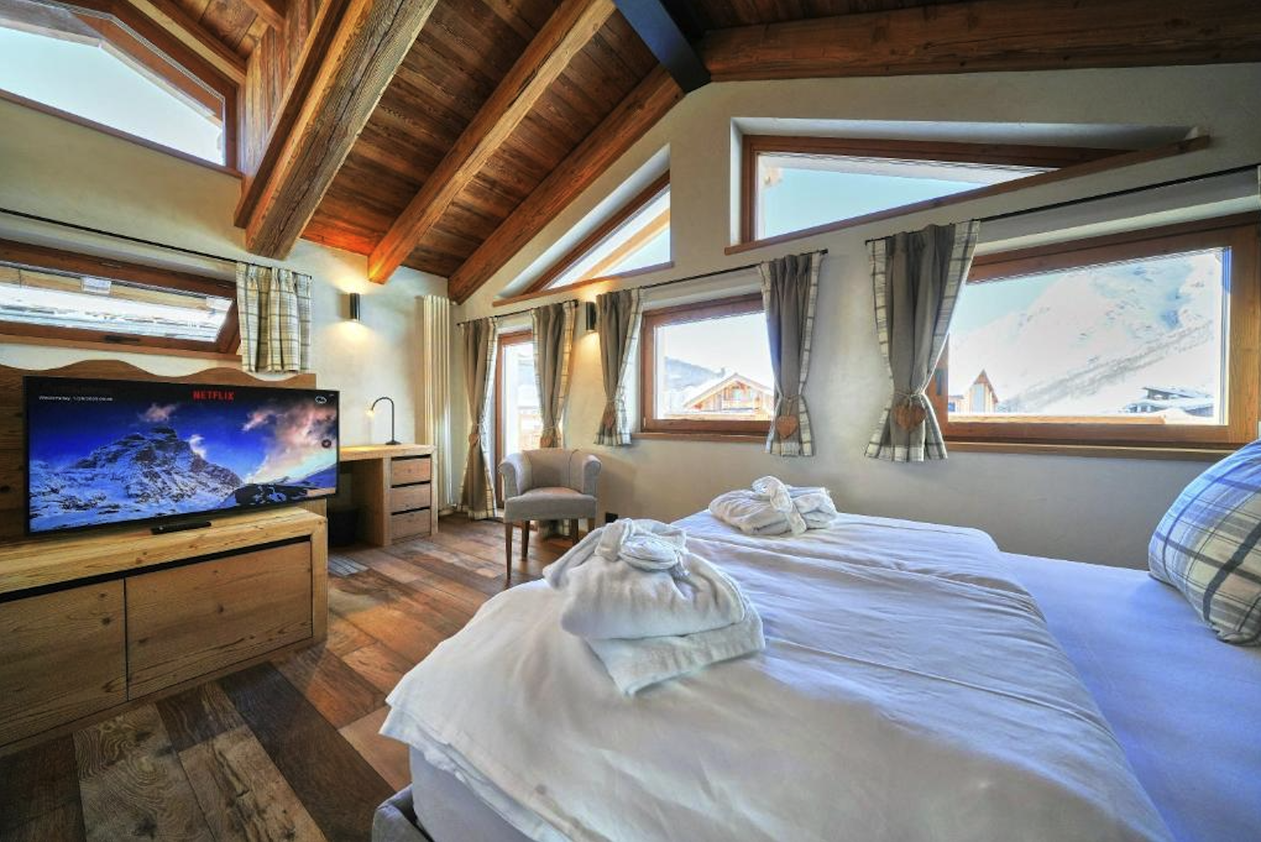 Les Chalets de Rose 2 är 100 m² och passar för upp till 4 personer. Chaletet erbjuder ett fullt utrustat kök, badrum, bastu, ett loungeområde, en dubbelsäng samt två enkelsängar. Chaletet har även ett skidförråd med pjäxvärmare.