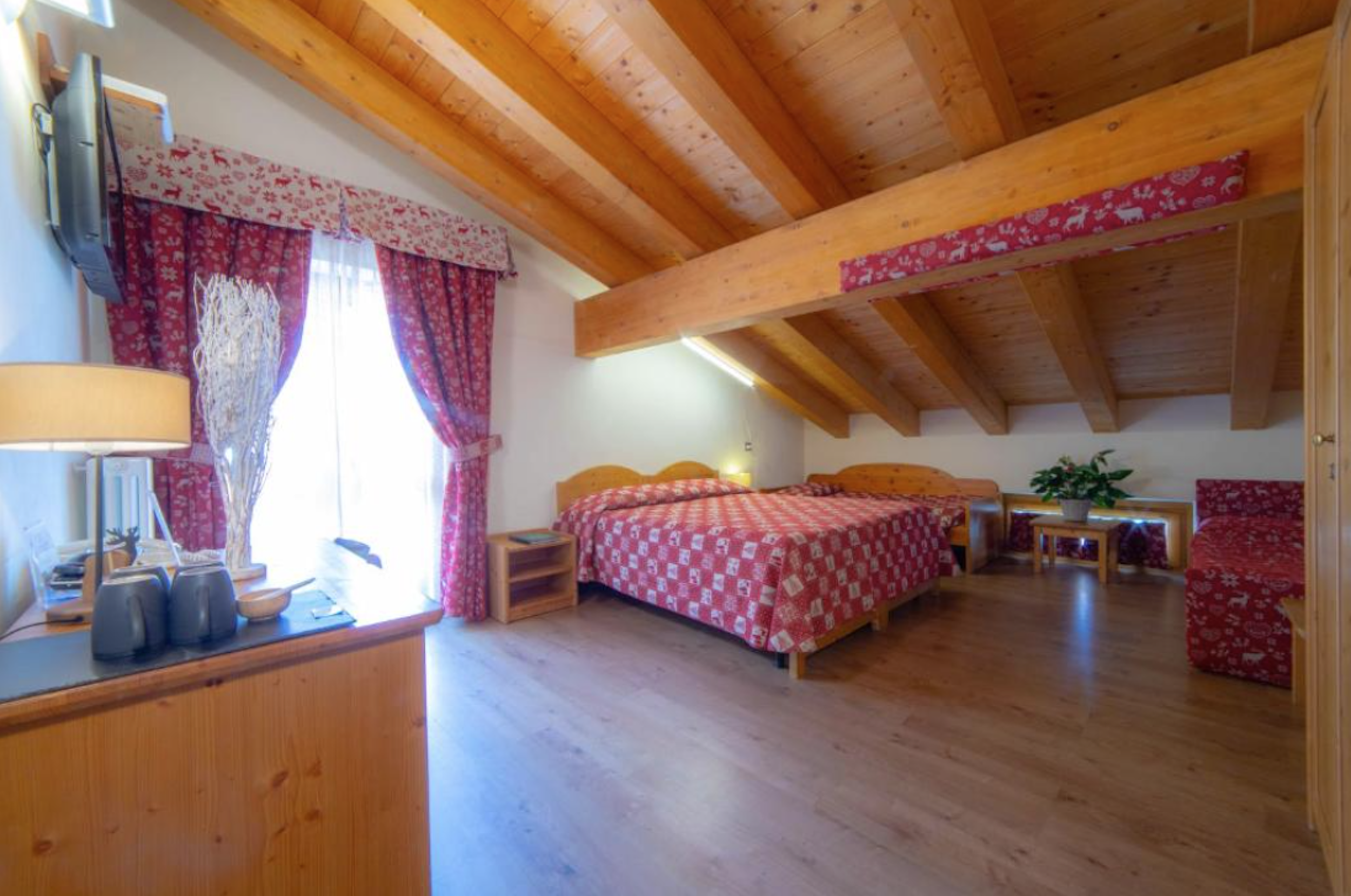 Familjerummet erbjuder gott om plats för familjer och är utrustat med allt som behövs för en bekväm och trivsam vistelse. Rummet är rymligt och har en inbjudande atmosfär, vilket gör det till en perfekt bas för en familjeupplevelse i Alperna. Rummet har privat badrum med toalett och dusch.